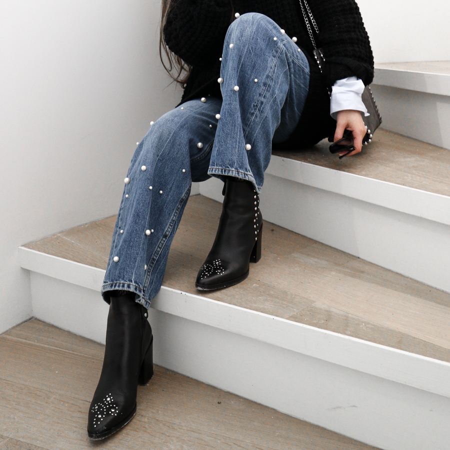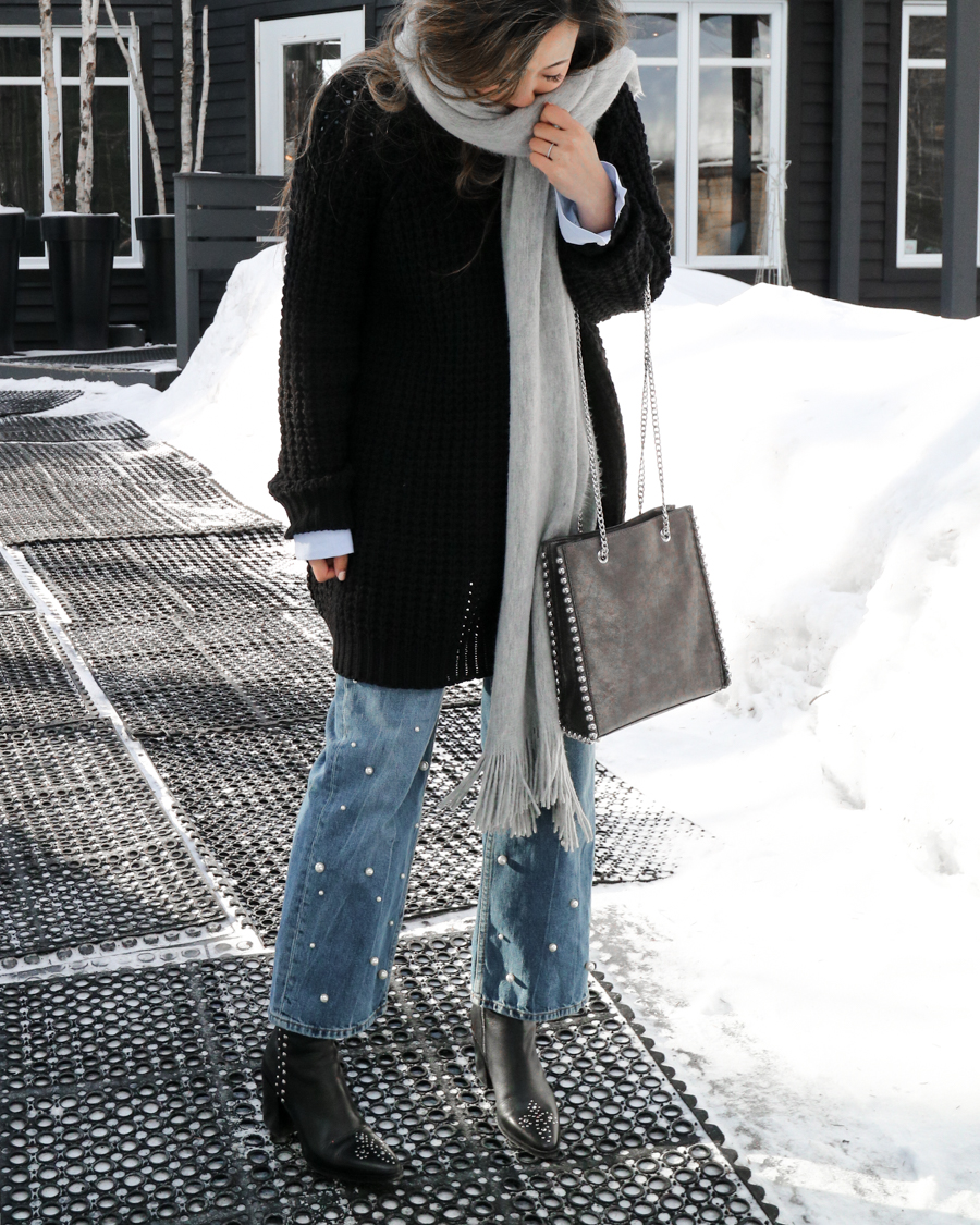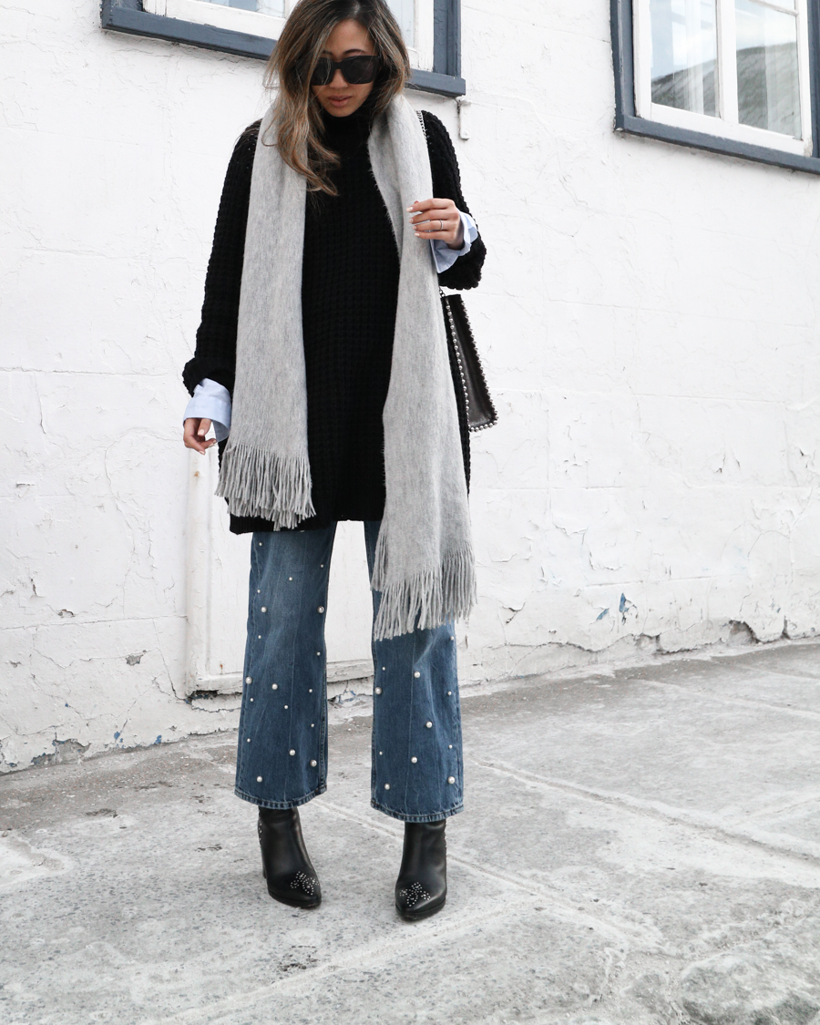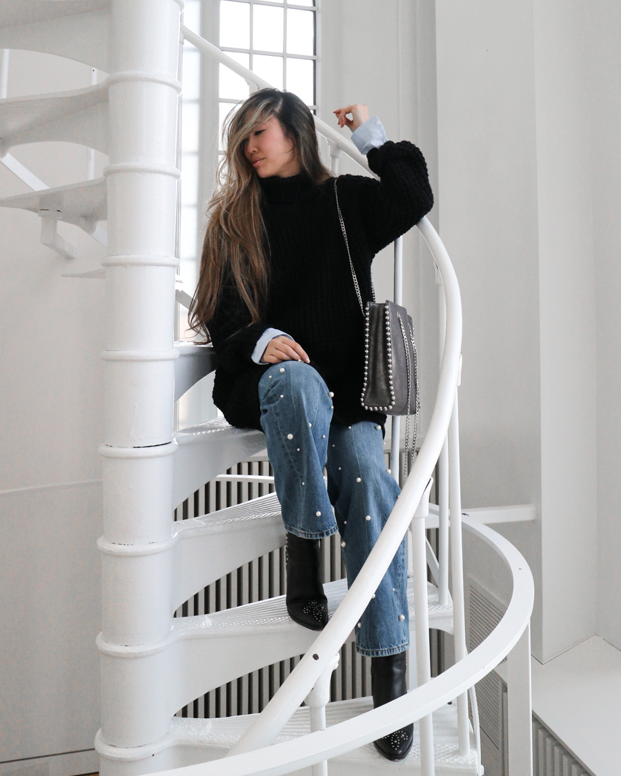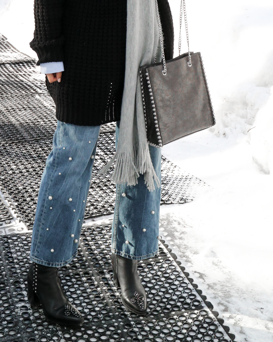 This pair of pearly denim goodness from Zara caught so much attention on my Instagram. They are the cutest pair of denim I own and can’t stop wearing it. I’m not particularly a fan of high waisted and wide legged denim, but these I can make an exception for. I gave them some contrast with studs on my handbag and booties.